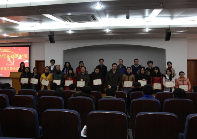 李峰书记首先总结了一年来党总支、院工会、计划生育宣传、学生办公室的工作情况,强调上述环节构成了基础医学院独具特色的党群工作平台,形成了“民主治院,和谐建院”的软实力,为我院教学、科研和研究生培养等各项工作的顺利进行提供了保障,并代表院领导班子着重表达了对各位党群工作人员的奉献以及对“平安校园”建设工作所付出努力的感谢。刘建平院长也做了精彩的讲话,一方面对大家一年来对我院各项工作的贡献表达了感谢,同时也对今后的工作提出了希望。在会上,请文萍主席、王超部长和院领导分别为获奖的“优秀党务工作者”、“公益事业先进个人”、“优秀党支部工作手册”、“优秀班主任”获得者以及“党员读书笔记优秀奖”的获得者师生代表颁发了证书。