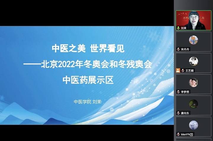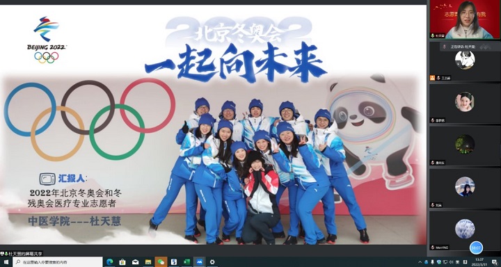 yl8858永利集团硕士第一党支部书记刘茉老师以“中医之美 世界看见——北京2022年冬奥会和冬残奥会中医药展示区”为主题,介绍了我校在北京冬残奥会承担的工作,如“10秒中医药体验馆”、医疗志愿者、城市志愿者、北京奥运村疫情隔离点等,并着重分享了位于“10秒中医药体验馆”的志愿服务经历。2022年北京冬残奥会中“10秒中医药体验馆”的展区,向世界各国运动员及随行人员展示了中医之美,进一步提升了中医学子的专业自信、文化自信和民族自信。
