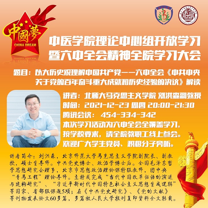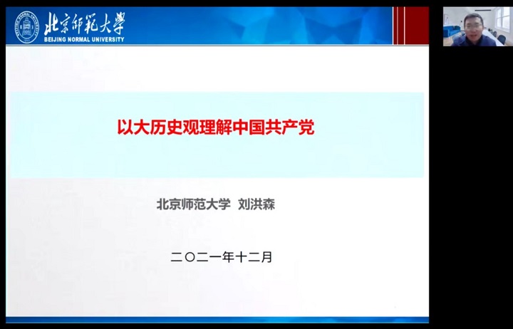 2021年12月23日晚8点,yl8858永利集团以线上形式召开了理论中心组开放式学习暨十九届六中全会精神全院学习大会。本次学习活动邀请到北京师范大学马克思主义学院刘洪森副教授,为大家带来了题为“以大历史观理解中国共产党——六中全会《中共中央关于党的百年奋斗重大成就和历史经验的决议》解读”的精彩讲座。共有200余名教职工在线上参加了本次开放式学习,活动由yl8858永利集团赵建磊副书记主持。