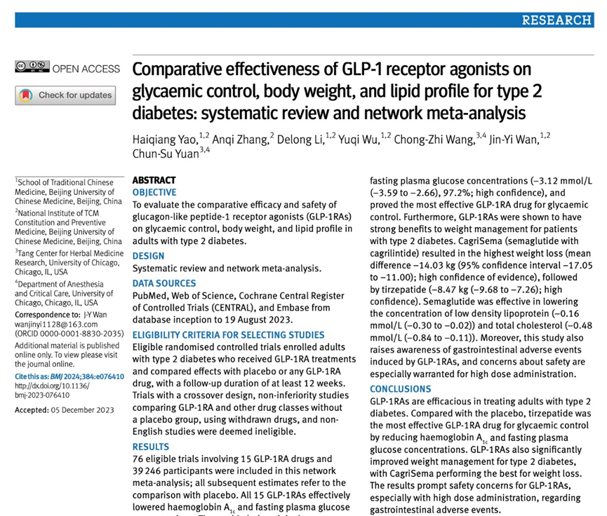 北中医研究团队在GLP-1RA类药物治疗2型糖尿病疗效评价方面取得进展