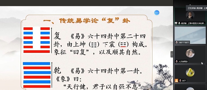本次研讨会开设了第一期“金元医学讲堂”,邀请上海中医药大学姚洁敏副教授做了讲座,题目是“易学思维与金元明医学的发展:以刘河间与张景岳对复卦的发展和运用为例”。姚教授以独特的易学思维视角,对金元以后医学主要代表刘河间与张景岳的学说思想进行了深入解读,由“复卦”入手展开,对二家医学学理从基础理论、方法论、临床实践三个角度,充分论证了易学在医学理论与实践中的作用,体现了哲学与自然科学学术范式的紧密结合。随后,上海中医药大学谭春雨副研究员对讲座进行点评,从元气观、阴阳观、五行观等方面讨论了人体生命的运行机制,由复卦延展至剥、否、泰卦,说明易经思想在中医学中的运用由来已久,中医现代化不能脱离哲学文化的历史背景,学科发展应着重关注其背后的思想体系。