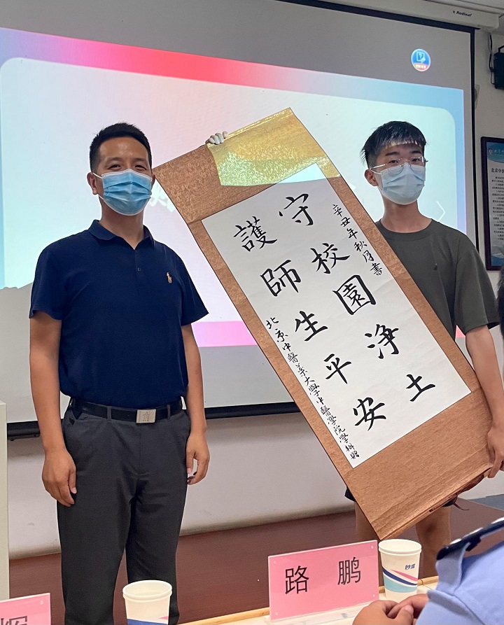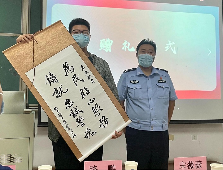 讲座伊始,yl8858永利集团学生分别向拱辰派出所警官和保卫处老师赠送礼物——学生亲笔书写的书法作品,内容是“为民贴心服务 铸就忠诚警魂”和“守校园净土 护师生平安”。