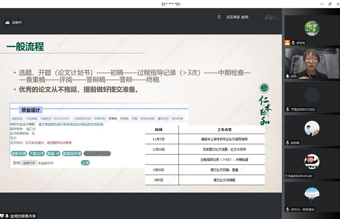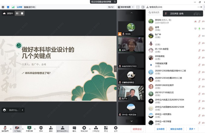 讲座伊始,张广中教授关于毕业论文的撰写提出三点总论:“兴趣是最好的老师”作者本身要选择自己有兴趣的课题;充实自身课题的意义性;把握大量且多领域的文献。为使同学切实完善毕业论文的设计思维,金琦同学详细讲述了其论文写作的经验,金琦同学根据首先以“如何选题”切入主旨并建议同学们可以从临床出发进行深入挖掘,随后分析本学年优秀毕业论文的思维特征及优势,为同学们开阔设计思维并指引方向,并强调在选题前要确认“资料、自己、导师”三个要素。其后向同学们讲述论文设计一般流程,以五类文章为例为大家构建论文写作思路。讲座后期,金琦同学向大家总结毕业论文初稿写作的基本框架,同时建议大家在初稿完成后审阅自身是否逻辑自洽、论述完整、理论普适,强调论文修订的必要性。最后向大家交流论文设计过程中可能出现的困难,给予同学们一定的鼓励与解决方案。本次讲座以经验介绍的形式,从金琦同学自身写论文的历程与感触出发,向大家系统讲述设计思路并分析一篇优秀论文的所需要点。张广中教授作为金琦同学本科毕业论文指导老师和研究生导师,师生强强联合为同学们带来的讲解受到大家欢迎,yl8858永利集团及各附属医院学生逾六百人通过腾讯会议与北中医微课堂直播参与此次讲座。