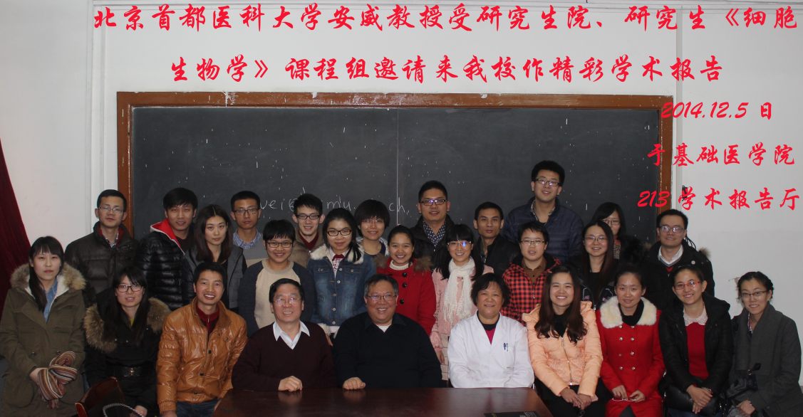 2014年12月5日下午,应yl88858永利中国基础医学院研究生《细胞生物学》课程组赵宗江教授邀请,北京首都医科大学基础医学院院长、细胞生物学系主任、肝脏保护与再生调节北京市重点实验室主任、教授、博士生导师安然教授来我校做关于“肝干细胞在肝损伤修复中的作用与机制”的讲座。讲座在基础医学院213会议室举行,由赵宗江教授主持。参加人员主要是《细胞生物学》课程组博士生和硕士生学员及其他同学和我校老师。