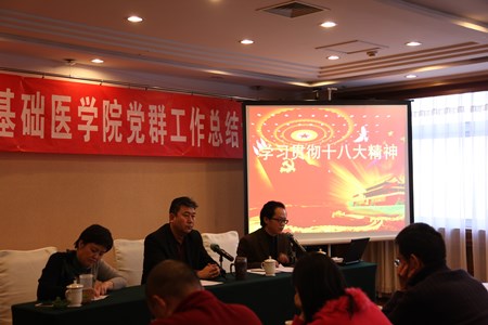 2012年11月30日,基础医学院党总支召开学习贯彻十八大精神培训会。会议由学院党总支马燕冬书记主持,校组织部马继福部长、赵小虎老师出席会议。基础医学院杜伟副书记、党总支周莉老师、全体党支部书记及专兼职辅导员班主任参加了培训。