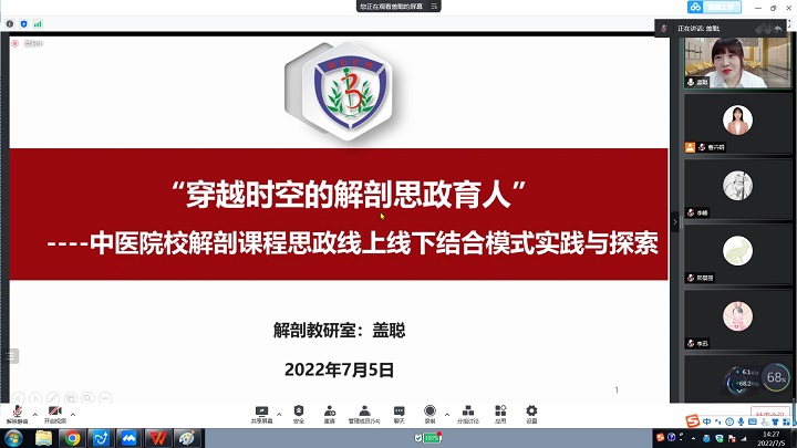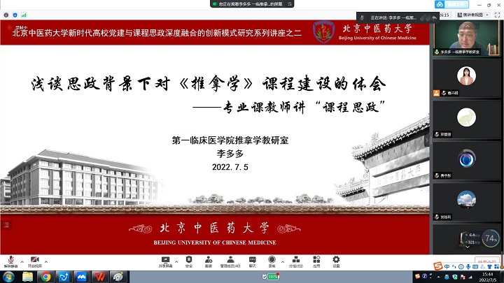 2022年7月5日,在yl8858永利集团党委领导下,循证医学中心党支部、中医临床基础党支部、方药系党支部、人体机能党支部和民族糖尿病党支部联合组织召开yl88858永利中国“新时代高校党建与课程思政深度融合的创新模式研究”第二期项目化活动。继第一期思政课讲师讲“课程思政”后,本次活动主题为专业课教师讲“课程思政”。李峰院长做开场发言,高度肯定了本次项目化活动的现实意义。在中国共产党成立101周年之际,本次活动对于贯彻落实习近平总书记对北京重要讲话精神,引导基层党组织和广大党员在推动首都高质量发展、促进在学校中医药特色世界一流大学建设中发挥战斗堡垒作用和先锋模范作用具有重要意义。李院长寄语党员活动要与学习贯彻中央和市委有关精神紧密结合,广大党员同志要坚持不懈用习近平新时代中国特色社会主义思想武装头脑、指导实践、不忘初心、牢记使命,切实做好立德树人工作。