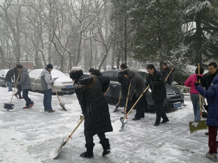 2012年12月14日,一场如期而至的大雪使学校周围银装素裹。景致虽美,但极易造成事故。一大早,基础医学院的很多老师自发到学院大厅,拿起铲雪工具到校园里打扫积雪,从行人便道到机动车道,围绕着基础医学院楼周围,包括老药系楼前,老师们都一丝不苟。雪还在下,老师们的衣服湿了,头发湿了,但是他们都顾不上擦一下,只希望能尽快为人们扫出一条便捷之路。基础医学院的老师们不仅在教学、科研方面是学校的半壁江山,就是在公益活动方面也是领先的。
