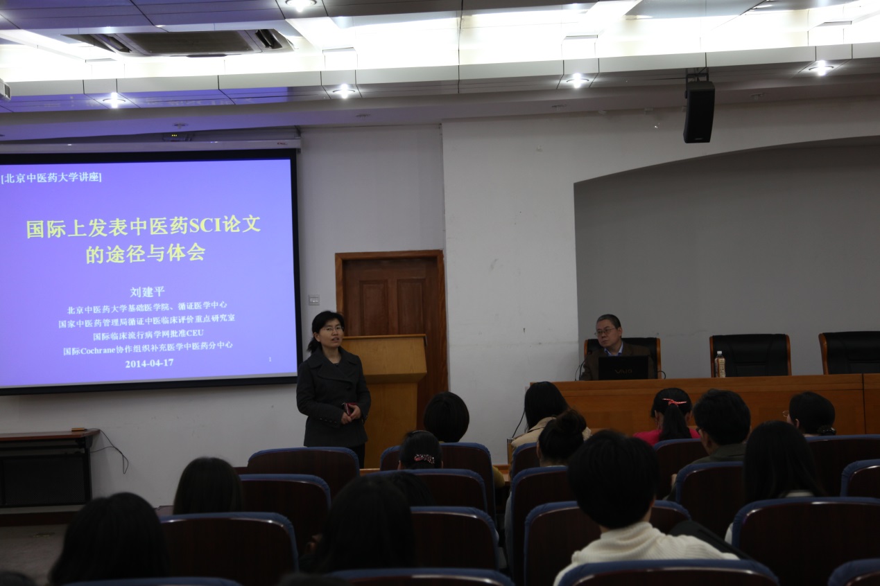 刘建平教授首先从“发表科研论文的重要性”和“发表科研论文所需要具备的基本素质和能力”谈起。刘教授指出,发表科研论文是科研能力的重要体现,是评价个人学术水平及评价大学和科研机构学术水平的体现,紧接着,他提到要发表科研论文需要具备专业的知识和技能,掌握科研方法和一门外语,严谨的科研精神,更重要的是要有好的老师指导。之后,刘教授针对中医药科研论文的写作谈起,深入浅出的讲解了中医药科研论文发表的步骤和要求,系统的讲解了期刊的影响因子及SCI论文投稿的要求和方法,并指出了中医药科研论文投稿SCI的期刊和投稿过程中应该注意的问题、技巧等。