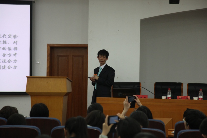 贾春华教授从事张仲景合方理论与临床应用研究多年,对张仲景合方理论有独到见解。贾教授从“什么是合方”、“为什么研究合方”、“怎么研究合方”、“研究合方有什么用”、“今后如何研究合方”等五个方面展开本场讲座,他认为张仲景创立的合方理论已经得到专家的共识,在疑难杂病的治疗中使用合方可以取得良好的疗效,但对于合方的使用,目前存在临床医家应用多而基础理论研究者探讨合方机理少,对合方的应用多基于功效相加的认识而尚未能认识到其“相恶” 、“相杀”等关系的存在的现状。合方研究当以文献学、逻辑学、现代实验的方法,对张仲景合方理论进行挖掘、对合方学术发展进行梳理,归纳合方的依据、合方的原则,探寻合方的功效、合方中方与方间的七情关系,以期发现合方内在之规律,指导临床应用,可创建合方理论的新学说。临床治疗中,可依据证候特征与病机特点进行合方。合方中方与方间的“相须”“相使”“相恶”“相畏”“相杀”“相反”的关系,在实际应用中可达到功效累加、协同或新功效的诞生。最后,贾教授还以举例的方式探讨了“先煎后合”和“先合后煎”两种方式在功效上的差异。贾教授的讲座激发了现场师生的浓厚兴趣,同学们踊跃提问。